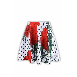 Необычный комплект для девочки белого цвета с яркими красными цветами и в черный горох состоит из кофточки и юбки.