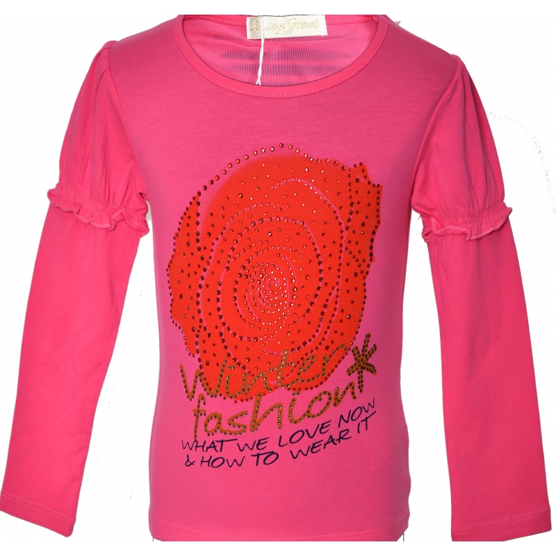 Батник из натуральной ткани для девочки с яркой розой и разрезами на спине.
